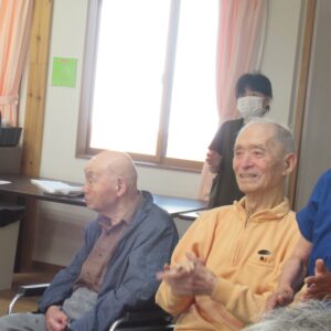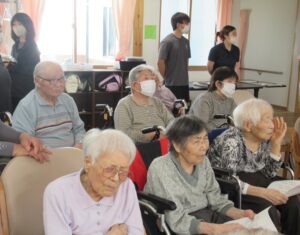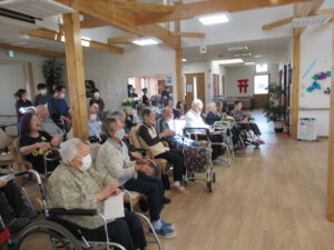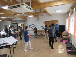 揃いのウサギのTシャツで、ふるさと他3曲を合唱。曲に合わせて終始指揮を執る利用者さんもいました。生演奏のビアノに合わせた美しいハーモニーを奏でた後は、炭坑節を踊り打ち解けた雰囲気に!