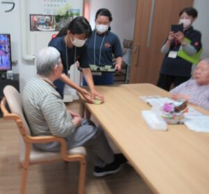 食事の配膳、お散歩を通じての車イス操作や口腔体操など、介護施設ならではのお仕事にも一生懸命でした。最後は利用者さんと楽しくお話する事ができて、やりがいを感じた様子でした。