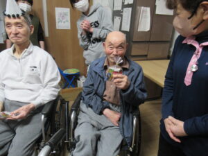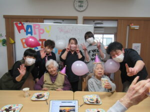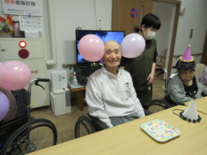 風船や帽子を付けた姿を「〇〇さんかわいい~!」と皆で誉めあって、ワハハッ!(笑)