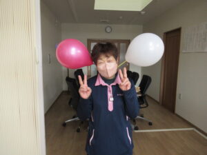 風船や帽子を付けた姿を「〇〇さんかわいい~!」と皆で誉めあって、ワハハッ!(笑)