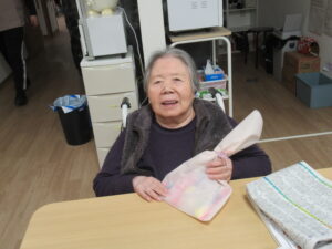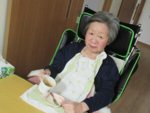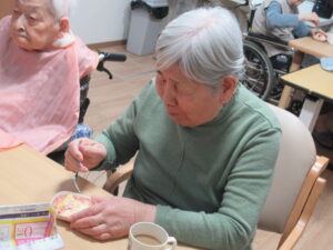 ケーキ🍰は100歳のお祝いでご家族さんが持ってきてくれました。ユニットの皆で美味しくいただきました。
