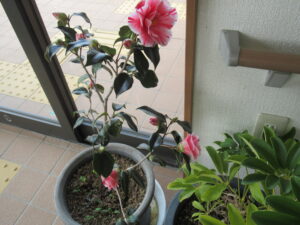 当日、玄関を見ると寒椿の花が開いていました。花も一緒に祝ってくれました。