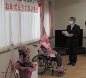 今年度2人目の100歳の方のお誕生日。一関市より祝状・花束・記念品が届きました。