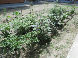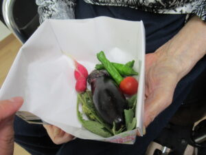 見守り隊の応援を受けて、初収獲を迎えました。利用者さん皆さん、廊下を通るたびに畑の様子を気にしています。成長する姿をみるのが楽しみな様子です。